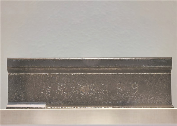該博物館展出的1899年漢陽(yáng)鐵廠(chǎng)生產(chǎn)的85磅鋼軌。王澤華 攝