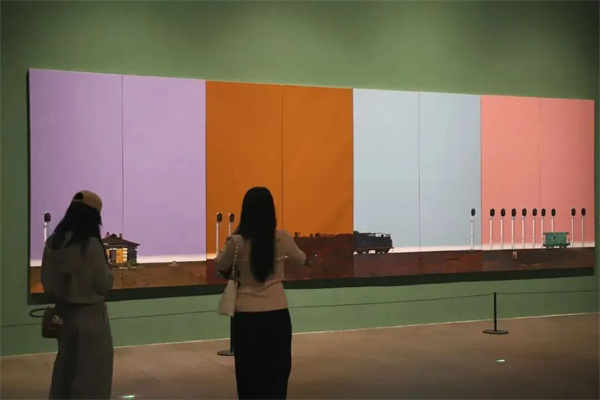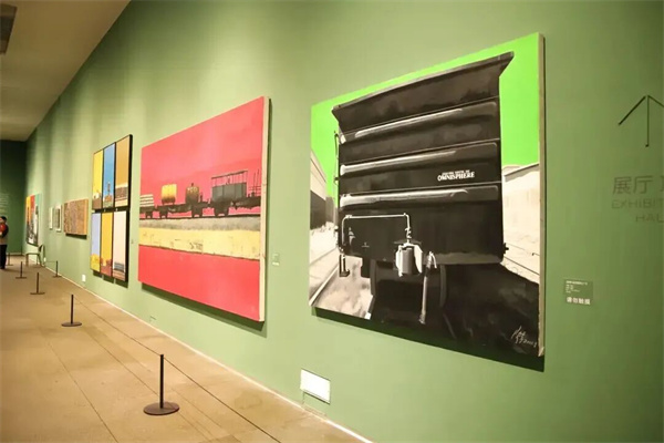 序廳以《奔騰·歲月》開(kāi)篇,描繪中國鐵路發(fā)展的重要階段。作品中的機車(chē)主體以黑、白、灰為主色調,盡顯硬朗雄厚的力量感;而背景的紅、黃、綠三種高飽和度純色,則為機械的冰冷感賦予了強烈的當代視覺(jué)沖擊力。觀(guān)眾得以從中國鐵路的巨變中,真切感受到中國的飛速發(fā)展和時(shí)代變遷。