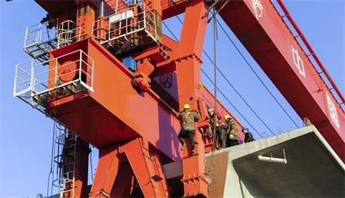 1月11日,山東棗莊,濟棗高鐵棗莊段施工現場(chǎng),工人利用架橋機等大型機械設備進(jìn)行箱梁架設作業(yè)。視覺(jué)中國供圖