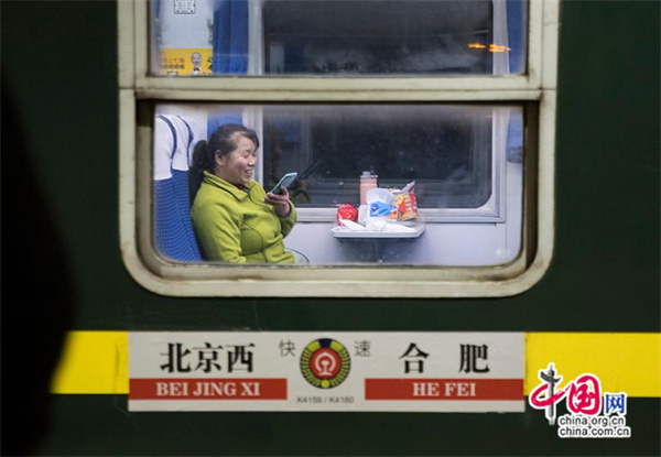 登上K4159次春運首班列車(chē)的乘客第一時(shí)間向家人報平安。中國網(wǎng)記者 馬曠/攝