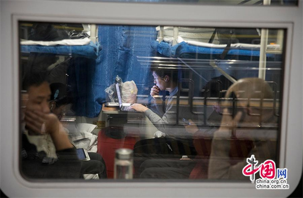踏上歸鄉的乘客仍不忘處理遺留的“手頭作業(yè)”。中國網(wǎng)記者 馬曠/攝