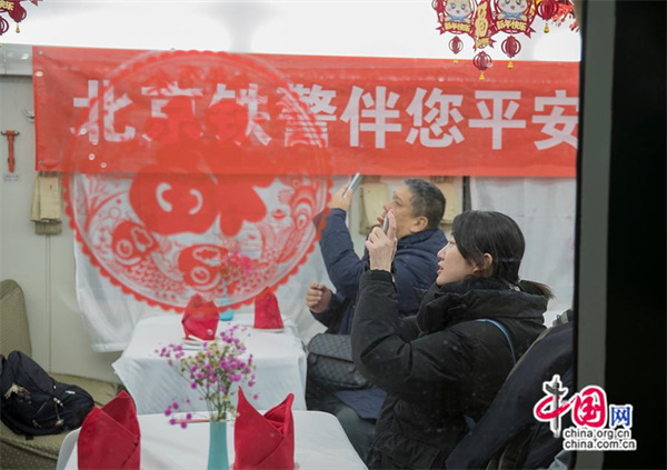 K4159次列車(chē)的餐車(chē)布置年味十足,引得旅客拍照打卡。中國網(wǎng)記者 馬曠/攝