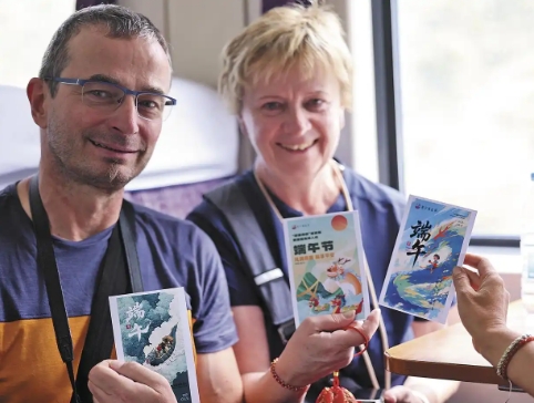 來(lái)自德國的夫婦收到乘務(wù)員自制的端午賀卡和香包后興奮地說(shuō):“沒(méi)想到在火車(chē)上還能體驗中國傳統節日,這次旅行讓我們難忘!”
